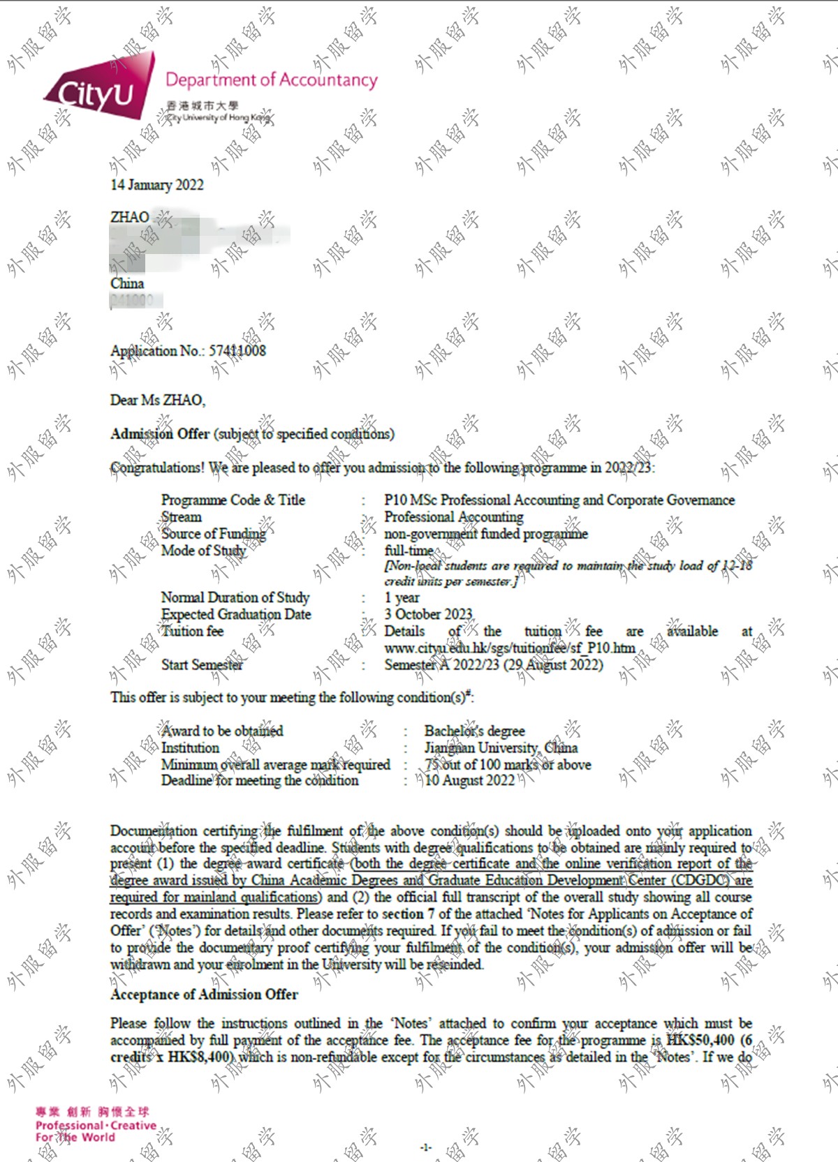 香港城市大学会计与公司治理专业硕士offer